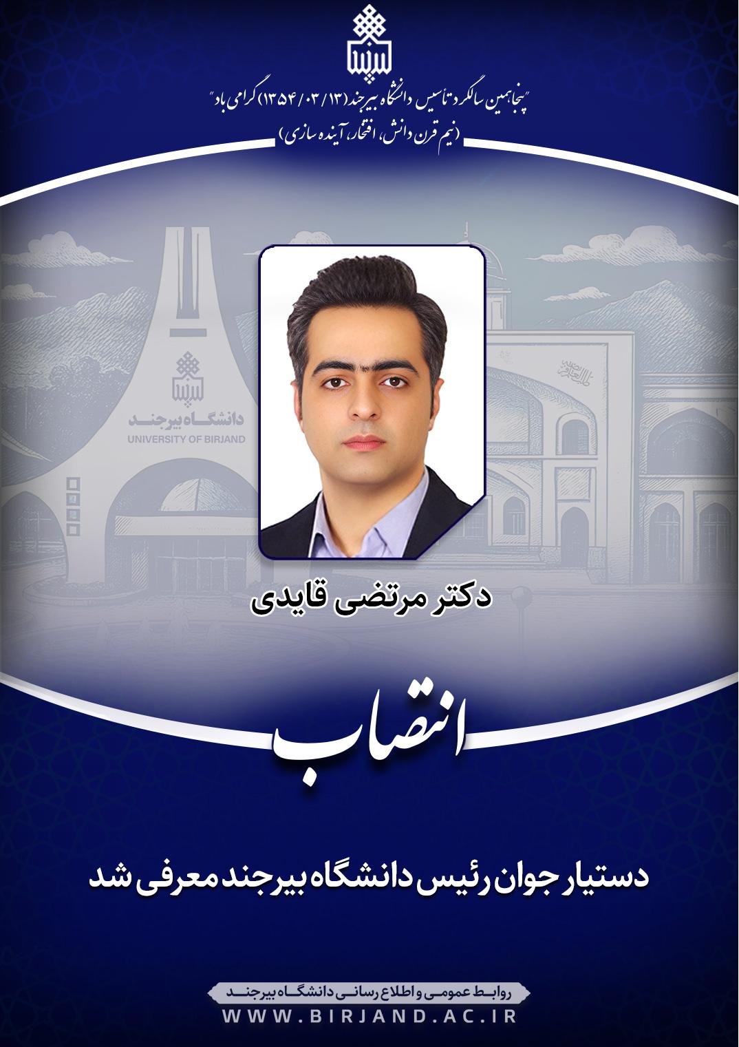 به گزارش روابط عمومی و اطلاع‌رسانی دانشگاه بیرجند، دکتر مرتضی قایدی، عضو هیأت علمی گروه مهندسی برق براساس نامه‌ای از سوی دکتر خامسان، سرپرست دانشگاه بیرجند به عنوان دستیار ویژه رئیس دانشگاه به استانداری خراسان جنوبی معرفی شد.