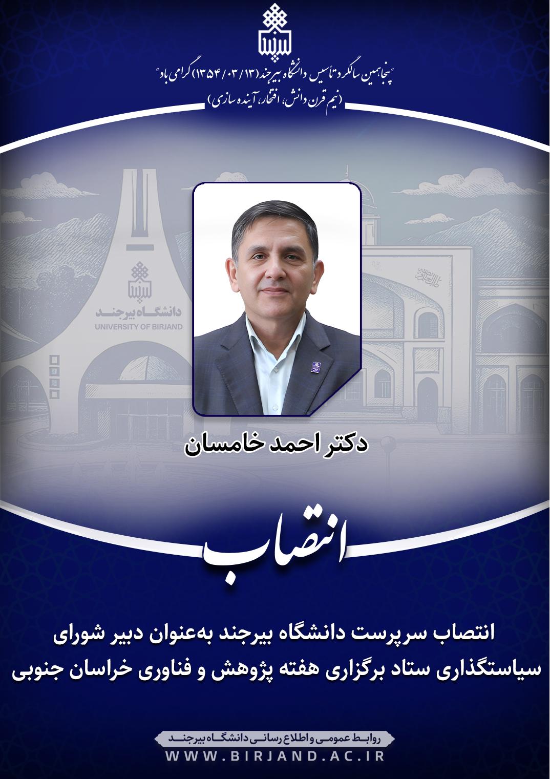 به گزارش روابط عمومی و اطلاع‌رسانی دانشگاه بیرجند، طی ابلاغی از سوی استاندار خراسان جنوبی و در اجرای ماده (۳) دستورالعمل ستاد استانی هفته پژوهش و فناوری و بر اساس نامه معاون پژوهشی وزارت علوم، تحقیقات و فناوری و رئیس ستاد ملی هفته پژوهش و فناوری کشور، دکتر خامسان، سرپرست دانشگاه بیرجند، به‌عنوان دبیر شورای سیاستگذاری ستاد هفته پژوهش و فناوری استان خراسان جنوبی منصوب شد.
