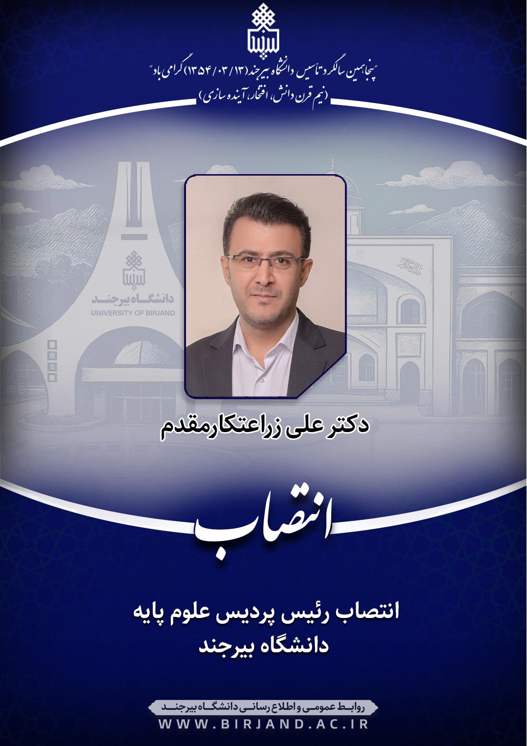به گزارش روابط عمومی و اطلاع‌رسانی دانشگاه بیرجند، در ابلاغ انتصاب دکتر علی زراعتکارمقدم آمده است؛ نظر به مراتب تعهد، تجارب و شایستگی‌های علمی و اجرایی جنابعالی، به موجب این ابلاغ و با حفظ سمت آموزشی و پژوهشی، به مدت دو سال به عنوان رئیس پردیس علوم پایه دانشـگاه منصوب می‌شوید. اطمینان دارم با اتکال به خداوند سبحان و بهره‌گیری از مشارکت و همفکری همکاران دانشگاهی، منشاء خدمات ارزنده‌ای خواهید بود.