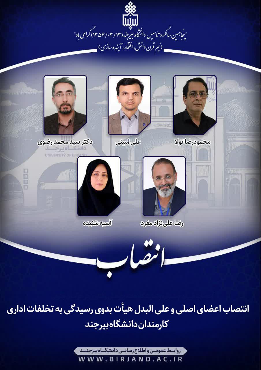 دکتر حسین سیمایی، وزیر علوم، تحقیقات و فناوری، طی احکام جداگانه‌ای، دکتر سیدمحمد رضوی، مهندس محمدرضا تولا و علی امینی را به مدت سه سال به سمت عضو اصلی و آسیه شنیده و رضا علی نژادمفرد را به عنوان اعضای علی البدل هیئت بدوی رسیدگی به تخلفات اداری کارمندان دانشگاه بیرجند منصوب کرد.