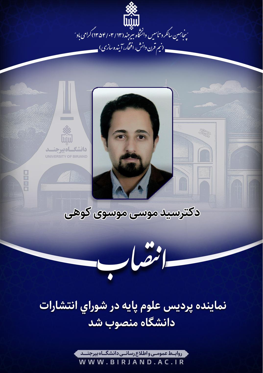 براساس ابلاغی از سوی دکتر احمد خامسان، سرپرست دانشگاه بیرجند، دکتر سیدموسی موسوی کوهی، عضو هیات علمی گروه آموزشی زیست شناسی به مدت دو سال به عنوان نماینده پردیس علوم پایه در شورای انتشارات دانشگاه منصوب شد.